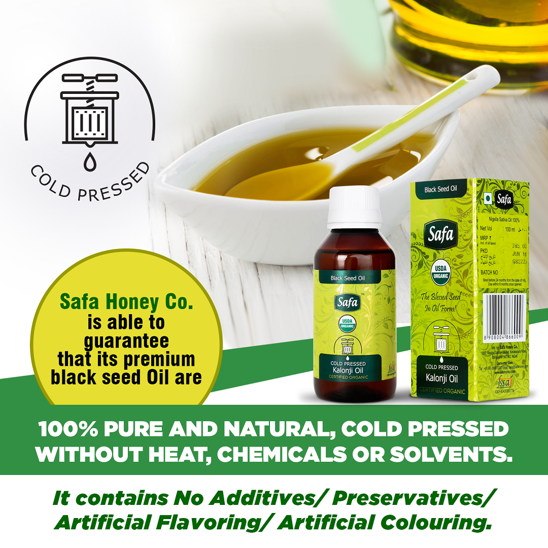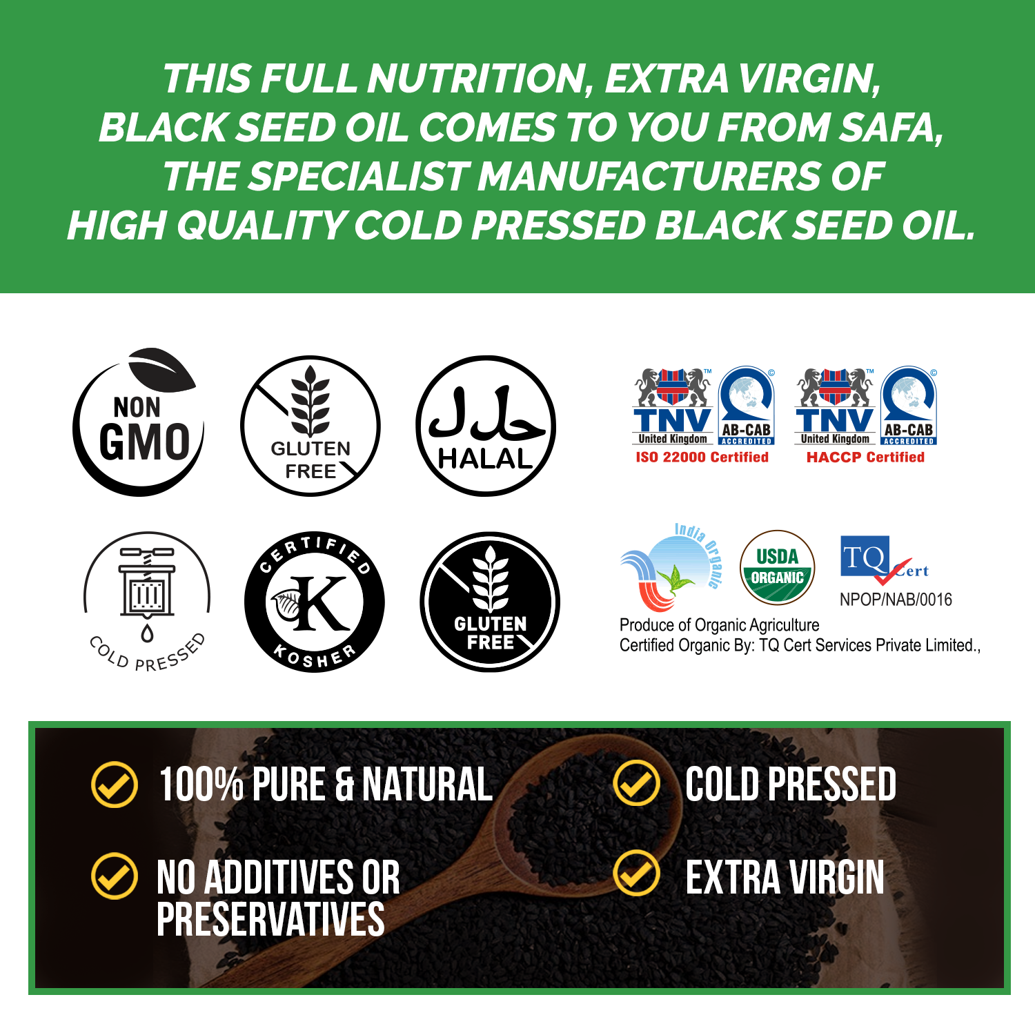 - 100% PURE AND NATURAL: Safa Coldpressed Black Seed Oil is 100% pure and natural. It is made from organic black seeds through cold-pressing extraction methods to preserve its nutrients and medicinal properties. Our Black Seed Oil is unheated, unadulterated, unfiltered, unrefined and does not contain any added colours or preservatives.
