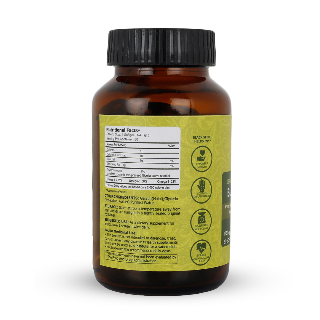 Designed for people on the go, Safa Black Seed Oil Capsules come in easily digestible gelatin capsules. It is also ideal for those who have a distaste for taking raw Black Seed Oil orally and yet want to seize the numerous benefits of the versatile Nigella sativa. Black Seeds are a traditional hit in alternative medicine. Its active ingredients support healthy immune functions and controls inflammatory responses underlying several diseases. Rich in Omega-3, 6 and 9 Essential Fatty Acids as well as Thymoquinone (TQ), Black Seed Oil is a great health supplement.